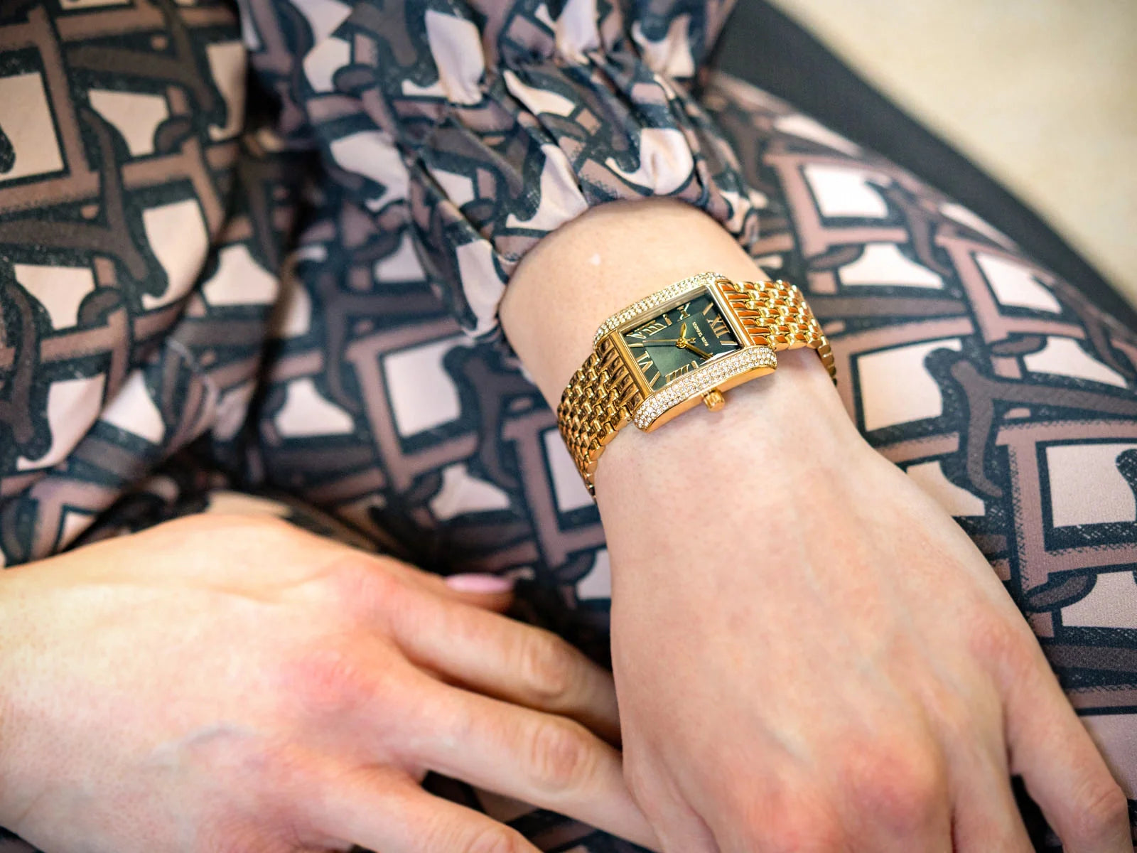 Sublimez votre poignet avec cette magnifique montre Michael Kors alliant sophistication et glamour. Son boîtier rectangulaire doré orné de cristaux pavé scintillants encadre élégamment un cadran vert émeraude profond aux chiffres romains dorés. Le bracelet en acier inoxydable doré à maillons entrelacés complète parfaitement ce design luxueux.
