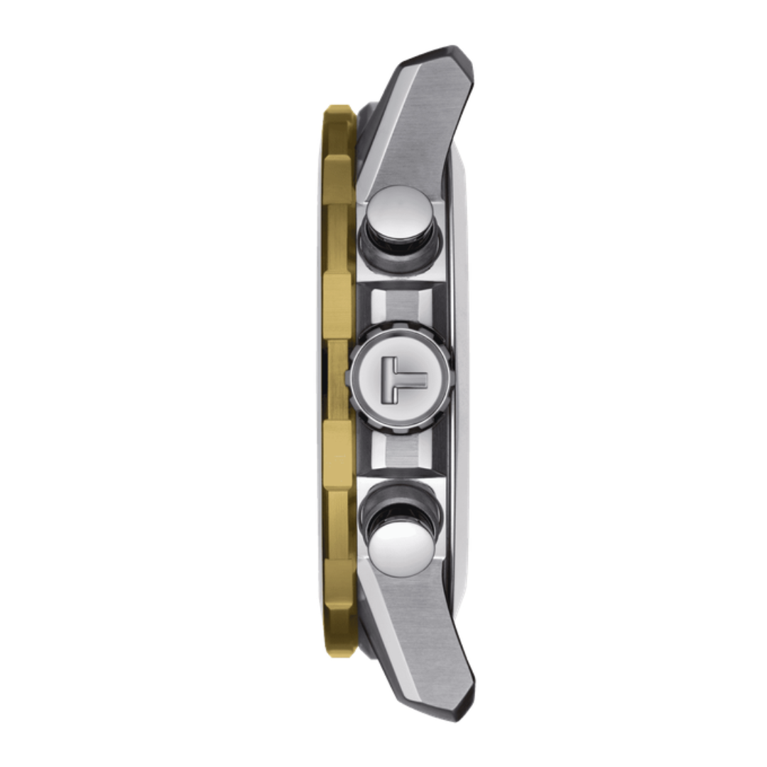 La Tissot Supersport T125.617.21.051.00 impose son caractère athlétique avec son imposant cadran noir aux accents dorés vibrants et sa lunette tachymétrique bicolore. Son boîtier robuste en acier et son bracelet intégré aux lignes sculpturales affirment une présence forte au poignet. Une montre chronographe qui incarne la performance et l'audace avec son design contemporain et ses finitions haut de gamme.