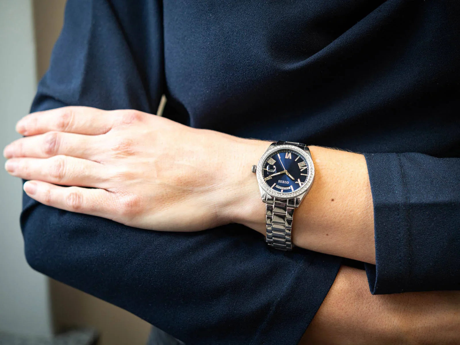 La Guess Luna GW0307L1 séduit par son cadran bleu profond orné de chiffres romains argentés et d’index scintillants. Sa lunette sertie de cristaux ajoute une touche de glamour raffiné, tandis que son bracelet en acier argenté assure confort et durabilité. Un design chic et intemporel, parfait pour sublimer vos tenues du quotidien comme de soirée. Une montre qui allie style et élégance avec brio.