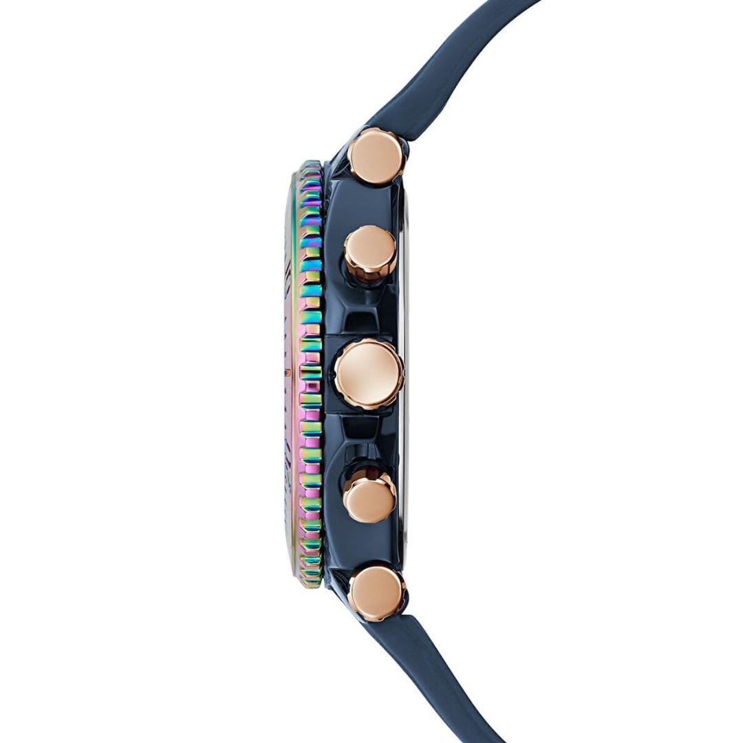 La Guess GW0466L2 enchante par son cadran bleu nuit rehaussé de compteurs violets qui créent un jeu chromatique raffiné et moderne. Sa lunette violette irisée et ses détails en or rose apportent une dimension luxueuse, tandis que son bracelet en silicone bleu marine aux surpiqûres violettes assure style et confort. Un chronographe féminin qui ose la couleur avec élégance, conçu pour la femme contemporaine qui exprime sa personnalité avec audace et sophistication.