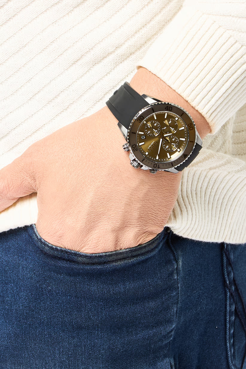 La Hugo Boss Admiral 1513967 impose sa robustesse avec son cadran kaki militaire aux index blancs lumineux et ses sous-compteurs chronographe parfaitement intégrés. Sa lunette tournante graduée et son boîtier acier brossé témoignent d'une résistance exceptionnelle, tandis que son bracelet en caoutchouc noir garantit confort et étanchéité absolue.